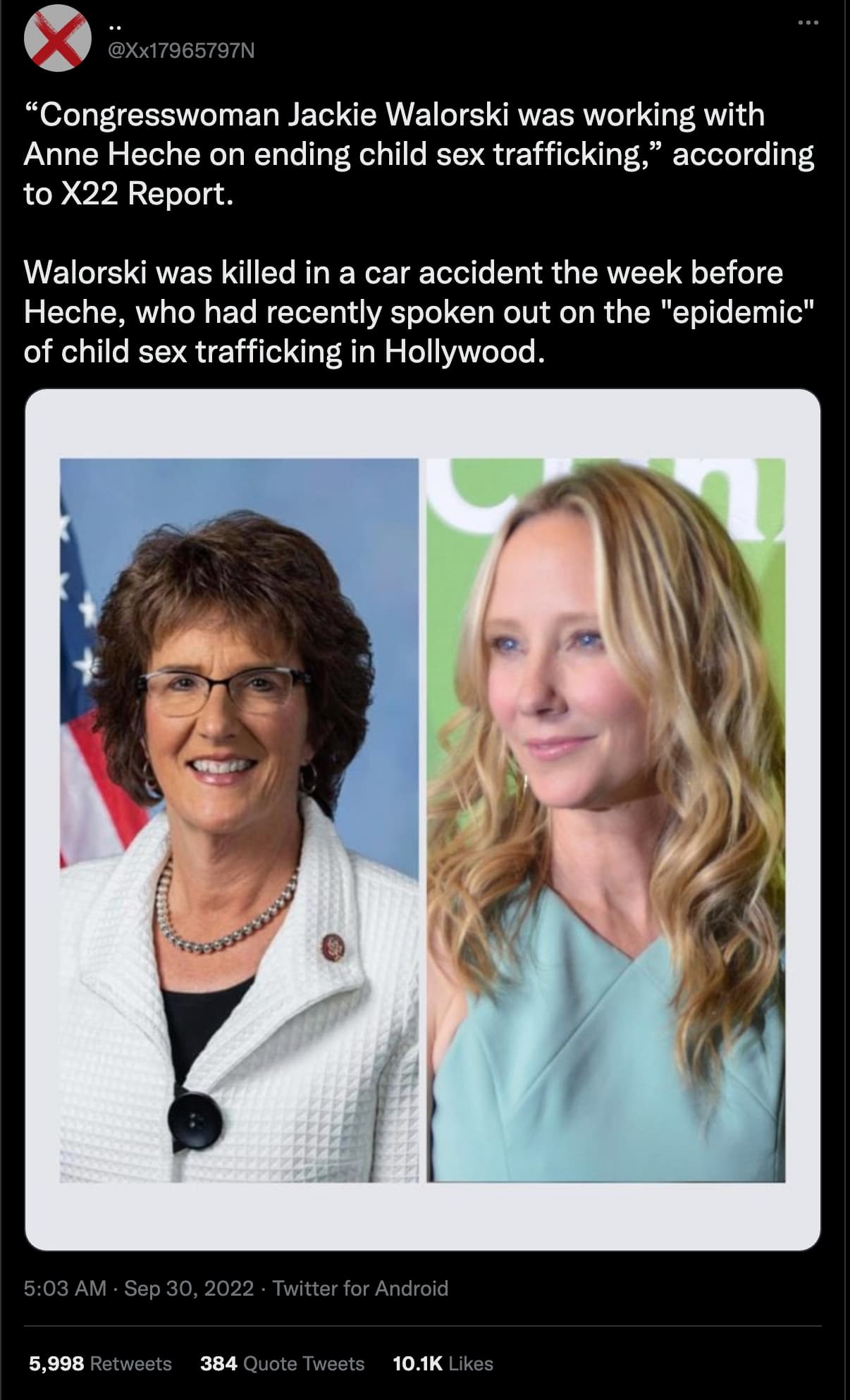 “Congresswoman Jackie Walorski was working with Anne Heche on ending child sex trafficking,” according to X22 Report.
