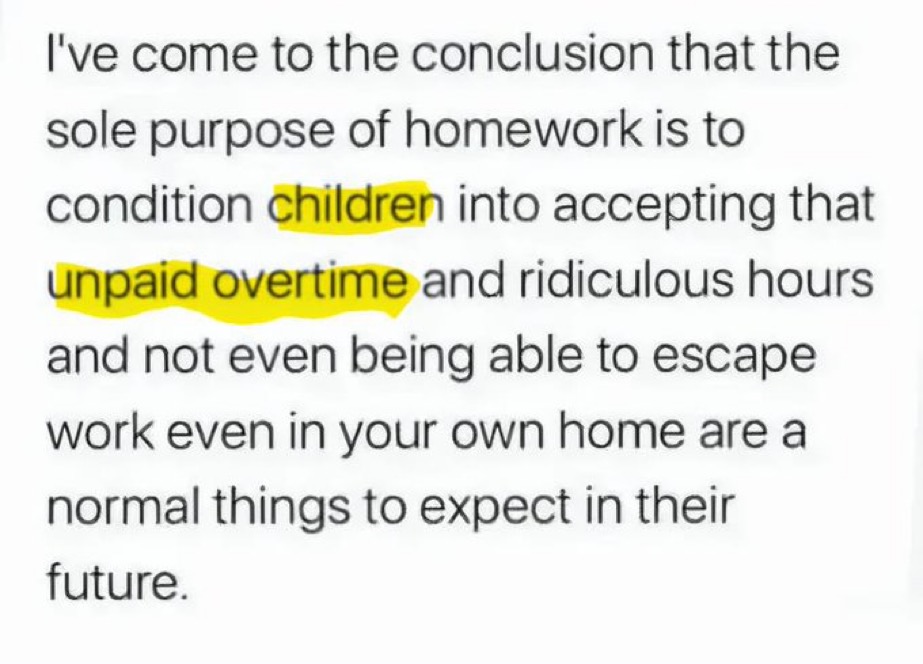 The fact they send kids home with homework, after a full day of school, just goes to show the level of control they have over children with no free time to think for themselves.