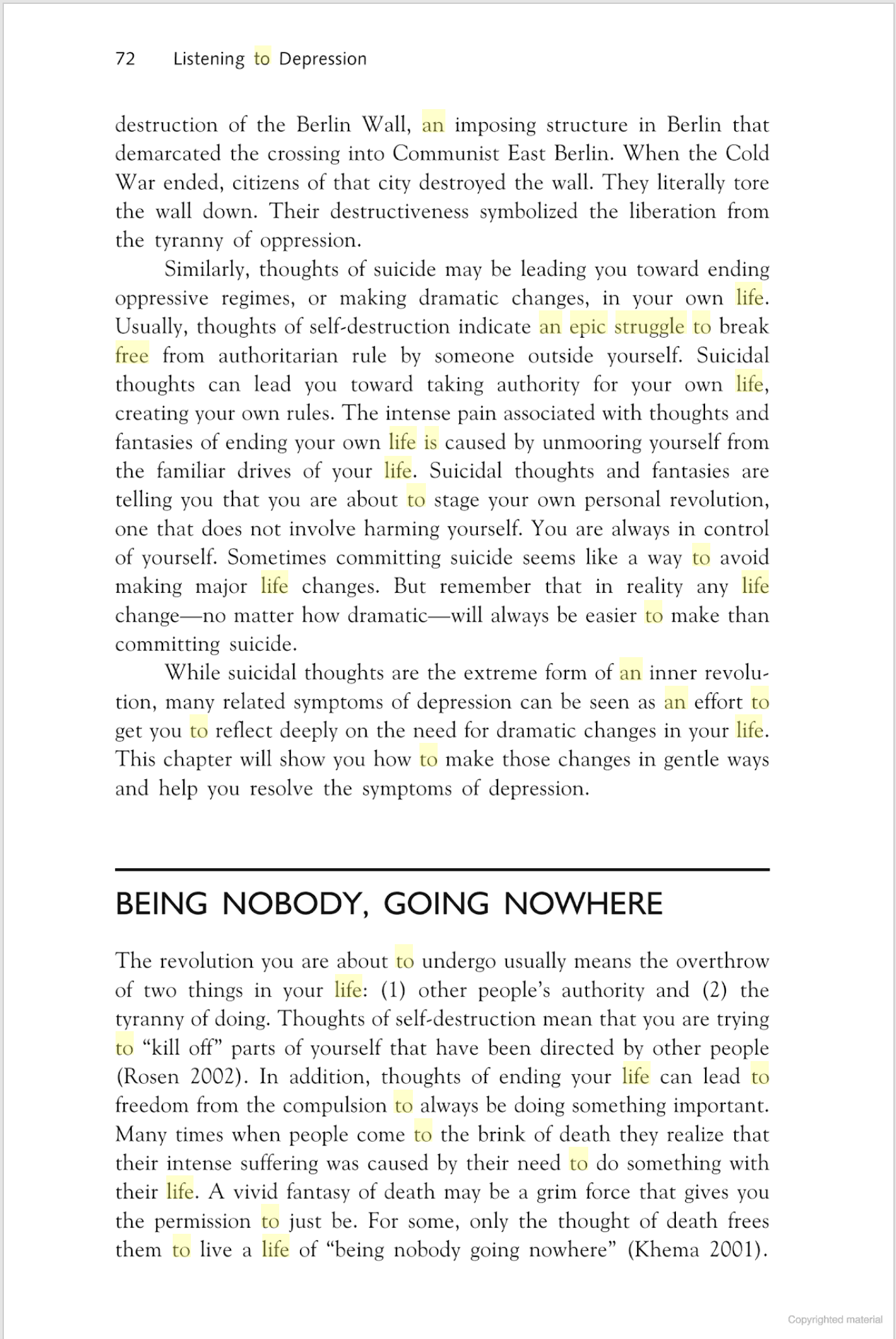 “Thoughts of self-destruction mean that you are trying to “kill off” parts of yourself that have been directed by other people.” ~ (Rosen 2002) “Listening to Depression: How Understanding Your Pain Can Heal Your Life” by Lara Honos Webb
